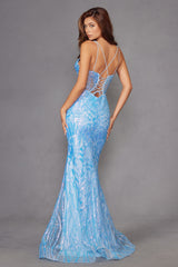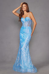 This exquisite dress is a true masterpiece, designed to captivate and enchant. It features a strapless, sweetheart neckline that elegantly frames the shoulders. The corset is fitted and adorned with intricate beadwork and sequins, creating a shimmering pattern that adds a touch beauty. The beadwork is dense at the top, resembling corset boning, which provides structure and support, then cascades down in vertical lines. The fabric is fine tulle overlaying a solid base, giving the gown both sheerness and depth. The fitted bodice transitions smoothly into a slight flair to create a graceful and dramatic effect. Perfect for formal events, this dress combines classic elegance with unique, nature-inspired detailing, ensuring you will stand out with its sophisticated and enchanting design.