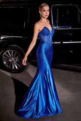 Description: Be the center of attention in this sultry strapless corset gown. This fitted stretch satin corset gown is designed to showcase your natural curves and make you feel like the queen of the night. The sheer boned corset features beautiful hot stone embellishment for a touch of sparkle and glamour, sure to draw all eyes on you as you enter any party, dance or prom night. With a side leg slit for added sexiness and flair, you won't fail to make an impact in this stunning dress.
