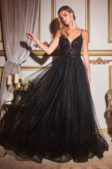 Description: A fan favorite, this a-line gown is layered in glittered luxe tulle and sparkling lace appliques. The illusion lace bodice has a deep neckline and thin double straps for an open back detail.