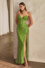 Description: Dazzle in this strapless fully beaded gown that defines glamour with every shimmering detail. The deep plunging neckline adds a touch of allure, drawing attention to your radiant confidence. Embrace modern elegance with side waist illusion cutouts that create a flattering silhouette, showcasing just the right amount of skin. The leg slit adds a hint of drama, allowing you to move with grace and style. The lace-up corset back not only ensures a perfect fit but also adds a touch of romance to this show-stopping ensemble. Whether you're attending a gala, red carpet event, or prom, this gown promises to make you the star of the show, leaving a trail of admiration in your wake. Step into the spotlight and let your beauty shine in this breathtaking creation.